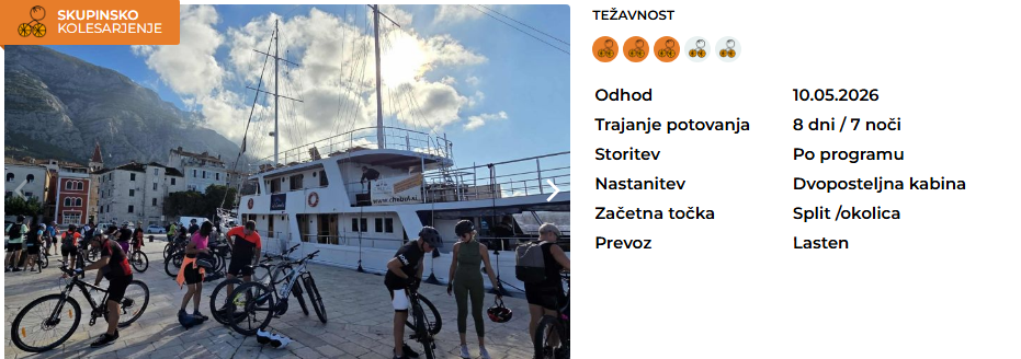 Križarjenje med jadranskimi otoki in celino, številne naravne in kulturne zanimivosti na poti, kopanje in udobno bivanje na ladji; vse to združujemo s kolesarjenjem, ki zagotavlja izjemen užitek, sprostitev in izziv vsakemu aktivnemu popotniku. Izkušena ladijska posadka skrbi za varno plovbo in dobro gostinsko ponudbo, vodnik pa za strokovno izvedbo potovanja.
